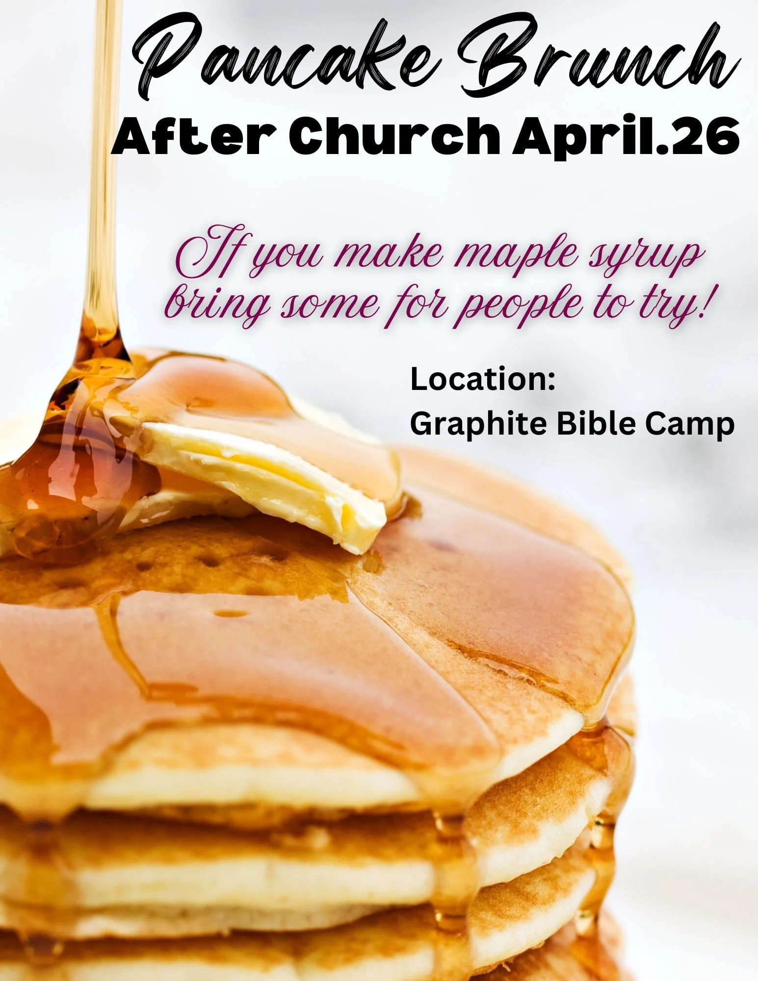 Pancake Lunch Sunday, April 26, 2026 11:15 AM 12:15 PM 11:15 12:15 Graphite Bible Chapel 702b Graphite Road Maynooth, ON, K0L 2S0 Canada (map) Google Calendar ICS